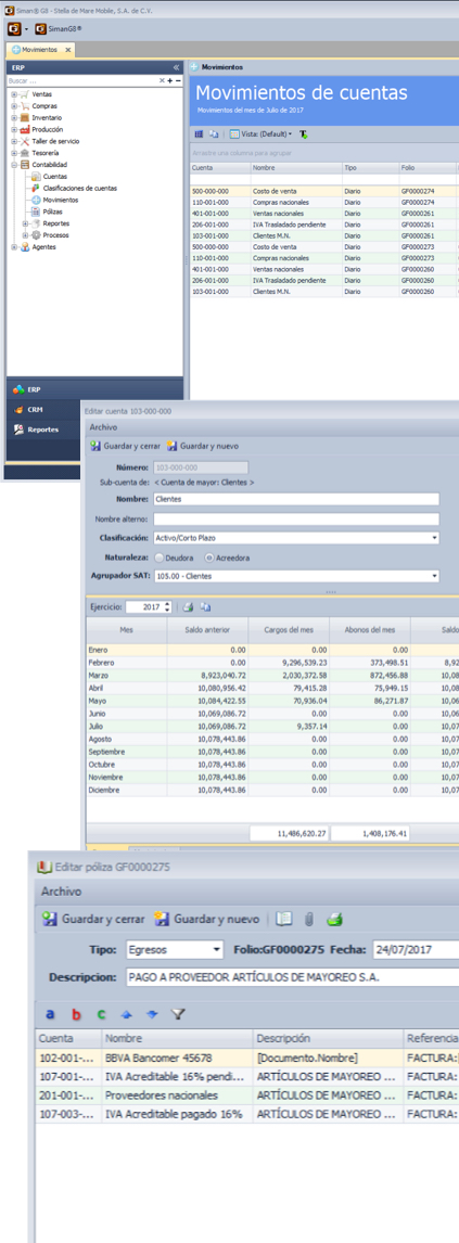 Con SimanG8® ERP la contabilidad se convierte en una verdadera herramienta de control y de análisis y toma de decisiones Porque la contabilidad va más allá de las obligaciones fiscales, el módulo contable de SimanG8® ERP se convierte en el eje central de la operación de todo el negocio, ofreciendo información inmediata de todos los procesos.