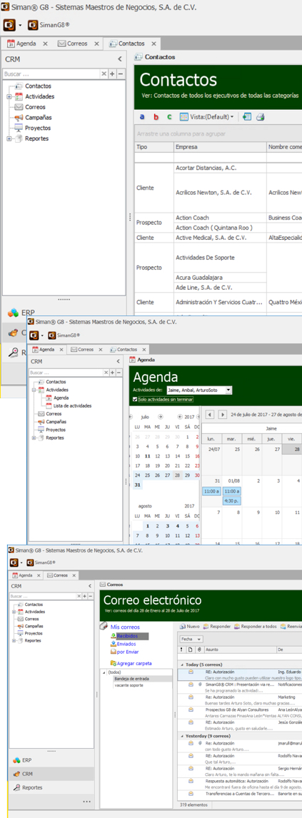 El módulo SimanG8® CRM se integra totalmente con el ERP, de tal forma que podrá ver información planeada y las interacciones reales. Este expediente se convertirá en el instrumento más valioso para la negociación con sus clientes y proveedores.